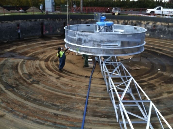Secondary treatment is a little more complicated. The dissolved solids are removed by a biological process known as the activated sludge process before the wastewater moves to secondary clarifiers for another round of biosolid settling. The activated sludge process increases phosphorous removal and fine bubble diffusion in the aeration tanks to enhance the transfer of oxygen needed for secondary treatment.