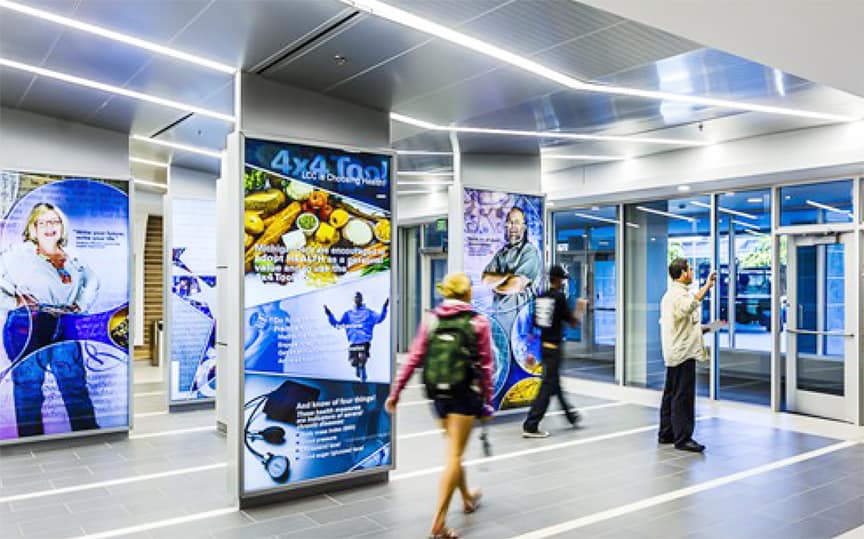 Every floor includes student-centered commons areas, multimedia centers, state-of-the-art smart boards and projection systems, and numerous workstations where students can plug in their technology devices and connect with other interactive devices. Over 250 works of art on display feature QR codes so those with smartphones can scan the codes and learn more about them.