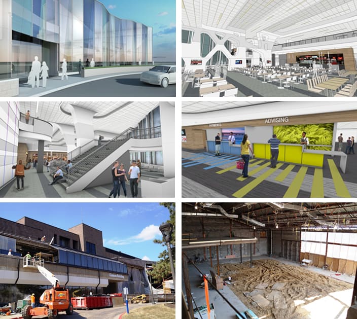 academic advising, counseling, and other student functions. A natatorium was converted into a student commons and food court area on the main floor and improvements to the perimeter including a faceted glass wall that winds along the buildings eastern face. All work took place while the building remained occupied.