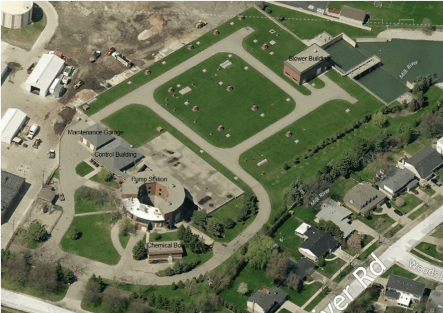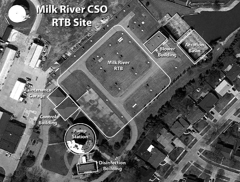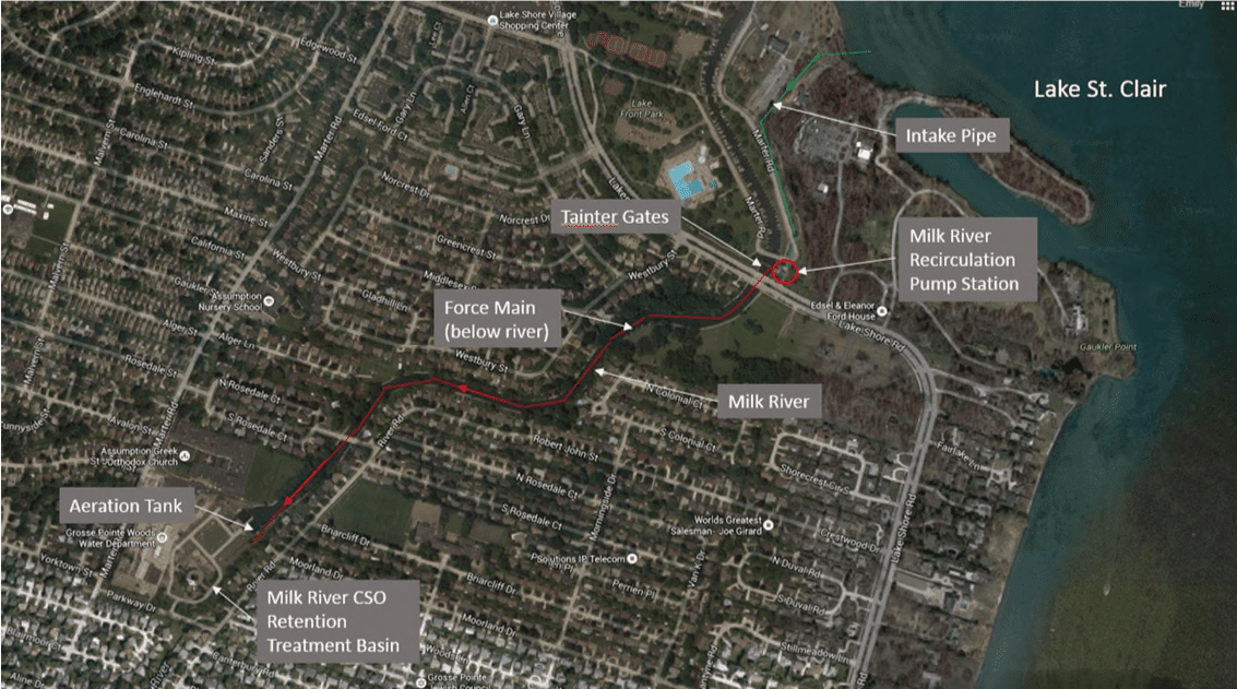 Enclosed drains transport these stormwater and combined sewage flows to the Milk River Retention Treatment Basin (RTB) facility where it is pumped into Wayne County’s Northeast Sewage Disposal System. During wet weather events, flows may be pumped into the RTB for storage. If the capacity of the RTB is exceeded during major wet weather events, flows are screened, settled, skimmed, and disinfected before being discharged into the Milk River. A recirculation facility is also utilized to seasonally pump lake water from Lake St. Clair to the outfall of the Milk River RTB to increase dissolved oxygen levels in the river.